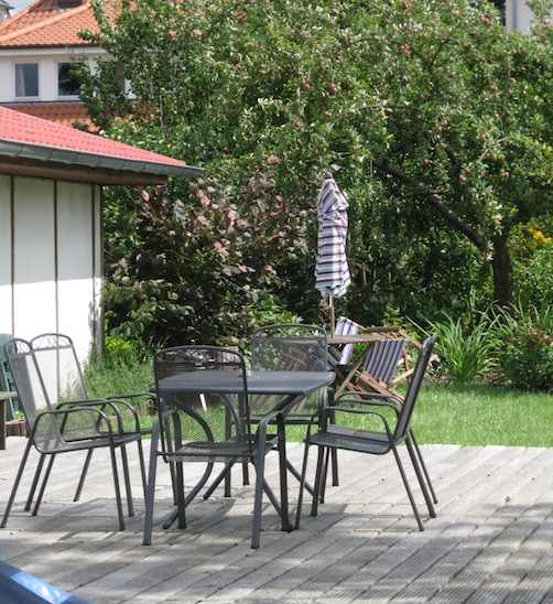 Unsere Sonnenterrasse bietet platz für 80 Gäste, die das bunte Treiben am Strand mit verfolgen, den Wasserskikünstlern bestaunen, den Booten zuwinken und dabei unser Hausgemachtes Eis genießen können.