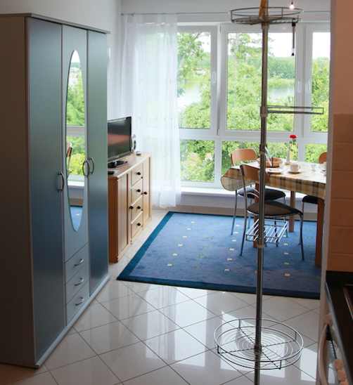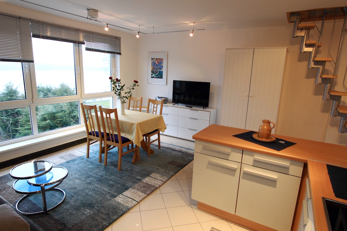 Komfortable Dachgeschosswohnung mit 45 m² Fläche und phantastischem Panoramablick über den Mirower See. Moderne Ausstattung, da bleiben keine Wünsche offen. Belegung mit 2 Erwachsenen Personen und einer möglichen weiteren Aufbettung swowie Terasse mit Badesteg am Seeufer. (Auf dem Grundriss in gelb gekennzeichnet)